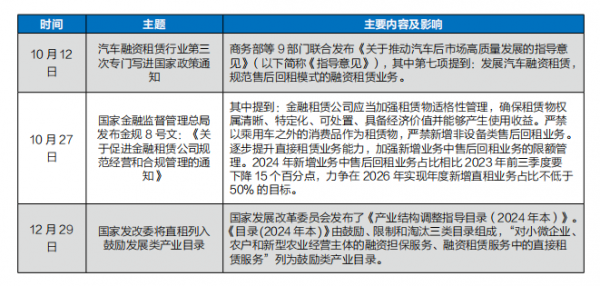 2023年汽車融資租賃行業(yè)處于行業(yè)整頓末期,多項(xiàng)政策相繼出臺(tái),對(duì)融資租賃市場(chǎng)進(jìn)行規(guī)范、修正與約束。主要內(nèi)容包括:引導(dǎo)金融租賃公司回歸以“融物”為核心的租賃經(jīng)營(yíng)模式,扭轉(zhuǎn)“類信貸”經(jīng)營(yíng)理念,包括對(duì)名租實(shí)貸的禁止、規(guī)范售后回租模式,鼓勵(lì)直租,努力提升直接租賃業(yè)務(wù)占比等。