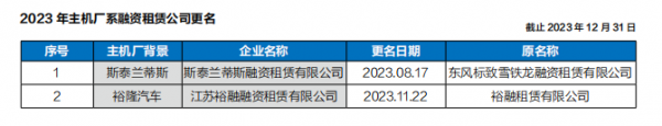 2023年有兩家主機(jī)廠系融資租賃公司進(jìn)行了名稱變更,分別是東風(fēng)標(biāo)致雪鐵龍融資租賃有限公司更名為斯泰蘭蒂斯融資租賃有限公司、裕融租賃有限公司更名為江蘇裕融融資租賃有限公司。